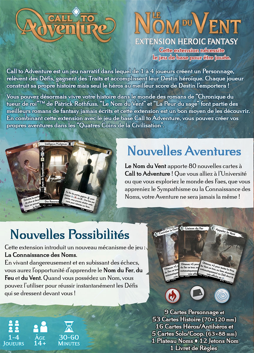 Vous pouvez désormais vivre votre histoire dans le monde des romans de « chronique du tueur de roi » de Patrick Rothfuss. « Le Nom du Vent » et « La Peur du Sage » font partie des meilleurs romans de fantasy jamais écrits et cette extension est un bon moyen de les découvrir. En combinant cette extension avec le jeu de base Call to Adventure, vous pouvez créer vos propres aventures dans les « Quatre Coins de la Civilisation ».