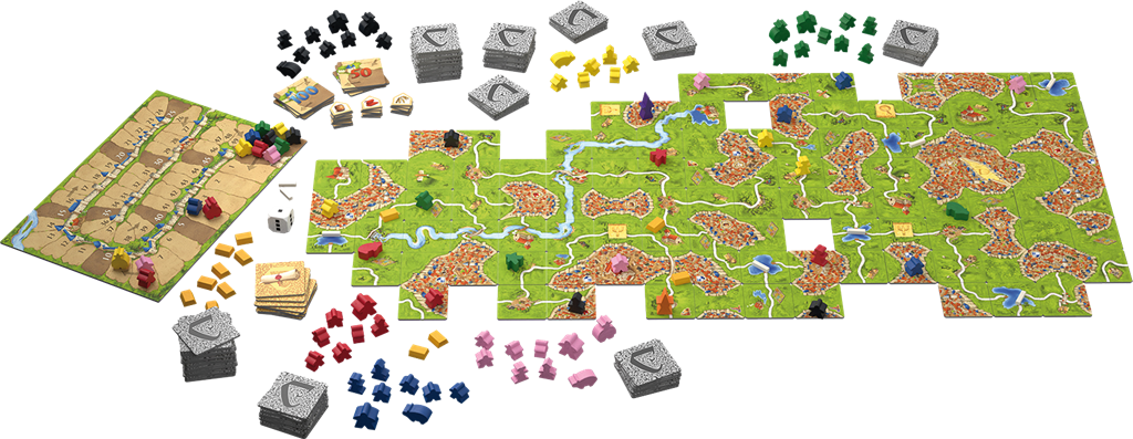 Les extensions incluses sont les suivantes : la rivière, l’abbé, Auberges & Cathédrales, Marchands & Bâtisseurs, les ornithoptères, les hérauts, les bacs, les mines d’or, Mage & sorcières, les voleurs, et les agroglyphes !