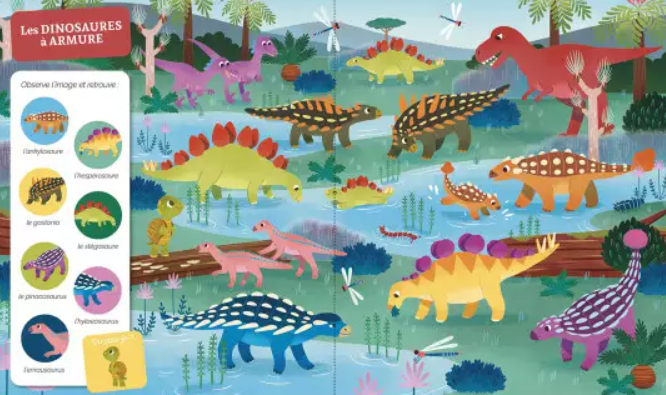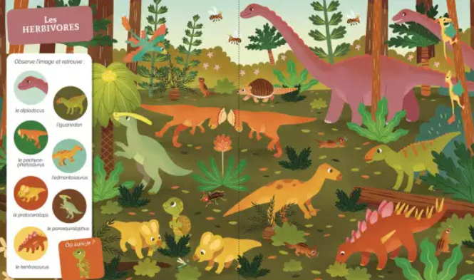 Les enfants sont transportés dans un univers peuplé de dinosaures, avec des scènes colorées et dynamiques. Chaque double page est une invitation à observer, découvrir et apprendre tout en s’amusant. Ce livre favorise le développement de l’attention et la capacité de concentration des jeunes lecteurs.