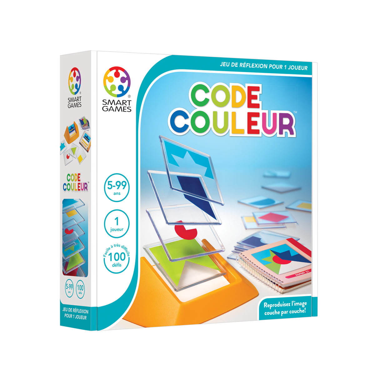 Un défi est à choisir parmi les 100 proposés. Apparaît une figure à reconstituer à partir des 18 plaquettes transparentes à superposer. Grâce aux couleurs visibles sur la figure, le joueur peut sélectionner les plaquettes à utiliser, sachant qu’elle sont toutes monochromes et que seules 2 d’entre elles contiennent la même couleur. Mais une fois les plaquettes de couleur identifiées, il faudra encore trouver dans quel sens positionner chaque forme et dans quel ordre placer ces différentes images pour reproduire la figure demandée. 4 niveaux de difficulté évolutifs sont proposés, avec un nombre croissant de plaquettes nécessaires : 2 images au niveau Starter, puis 1 supplémentaire par niveau, pour atteindre 5 en Master. Le nombre de combinaisons possibles ne fait donc qu’augmenter, pour pimenter le jeu et satisfaire tous les âges.