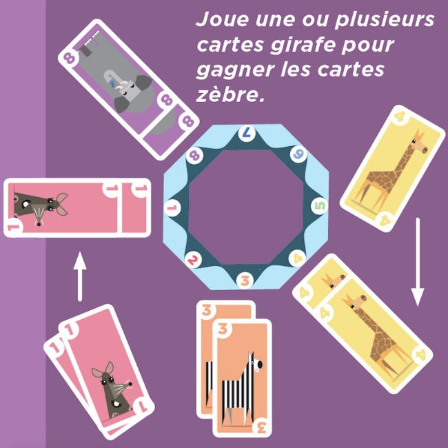 Au coeur de la savane, les animaux viennent sabreuver au bord du lac, mais la loi du plus fort domine ! Ton but sera de gagner le plus de cartes possible. À ton tour, joue la carte Animal qui chassera les autres au risque de te faire chasser à ton tour. Dans ce jeu, léléphant est roi… sauf quand la souris passe par là. Il faut minimum 3 cartes d’un même animal pour faire fuir le premier animal plus petit présent autour de l’eau. Si 3 cartes sont déjà présentes, il suffit d’en ajouter 1 pour gagner les cartes plus petites !