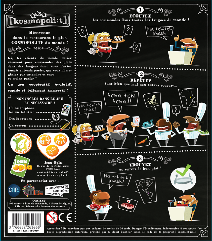 [kosmopoliːt] se joue de 4 à 8 joueurs parmi lesquels il y a toujours une Serveuse, un Maître d’Hôtel et des Cuistots. La Serveuse gérera la salle de restaurant sur l’appli, elle aura ses écouteurs sur les oreilles et pourra prendre les commandes des clients qu’elle transmettra aux Cuistots et surtout au Maître d’Hôtel. Sauf que nos clients viennent du monde entier, et souhaitent déguster des plats typiques qu’ils demandent dans l’une de leurs 60 langues natives !Le Maître d’Hôtel note du mieux qu’il peut toutes les commandes de la Serveuse, et les répète en permanence aux Cuistots. Il a le rôle pivot du restaurant, il fait le lien durant toute la partie entre la salle et la cuisine, et a la charge de coordonner et manager l’ensemble.