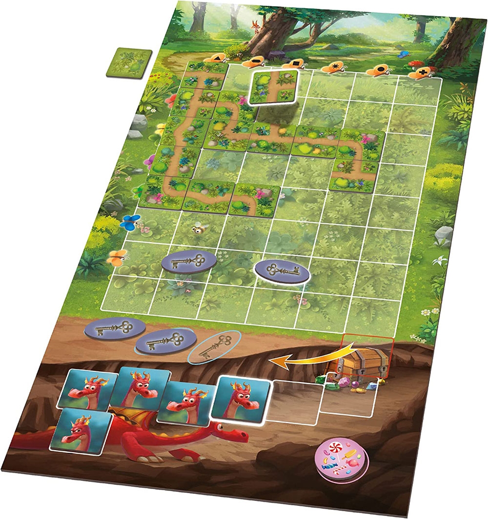En posant chacun leur tour une tuile sur le plateau, les joueurs doivent faire équipe pour se frayer un chemin au milieu de la forêt et récolter les trois clés qui permettent d’ouvrir le coffre. Mais il ne faut pas trop tarder car le dragon est sur le chemin du retour et il risque fort de surprendre les lutins… et de garder son précieux butin !