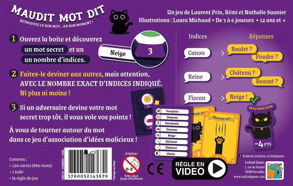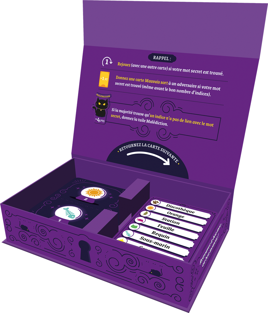 Dans la boîte magique, les dos de cartes de gauche indiquent deux mots sur les rectos de droite, avec un nombre d’indices autorisés pour chaque. Chacun leur tour, les joueurs doivent faire deviner aux autres. Le joueur actif choisit l’un des deux mots et trouve un premier indice qu’il trouve à voix haute. Les autres joueurs ont droit à trois propositions avant qu’un second indice soit proposé, et ainsi de suite.