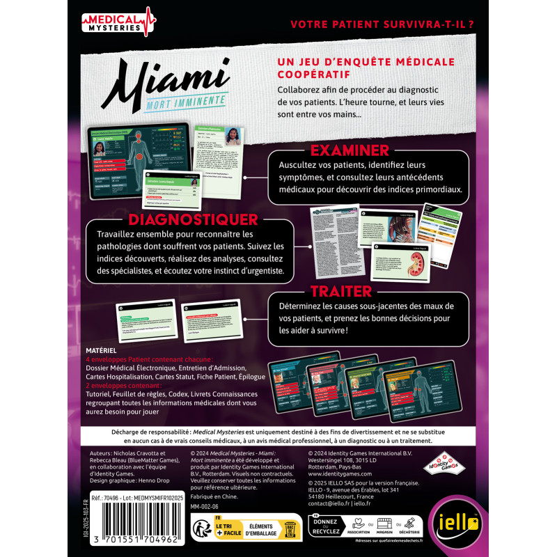 Les joueurs examinent symptômes, antécédents et indices pour identifier la maladie et choisir les bons traitements. À chaque action, ils consultent un codex qui indique les conséquences en fonction de l’heure et de l’état du patient. Un tutoriel initie aux mécaniques, puis quatre dossiers principaux proposent des difficultés variées à résoudre en coopération.