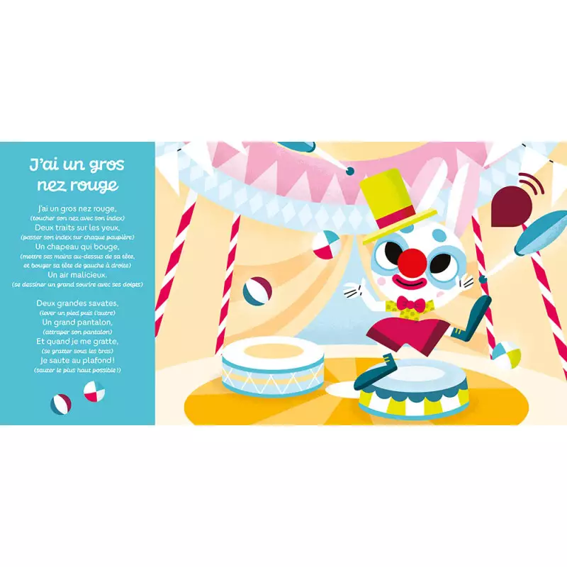 Avec ses scènes joyeusement illustrées et ses chansons entraînantes, ce livre invite les tout-petits à bouger en musique. Chaque double page met en scène une comptine traditionnelle qui stimule le mouvement, la coordination et l’éveil corporel. L’ambiance est dynamique, festive et propice à la découverte des gestes simples de la danse.