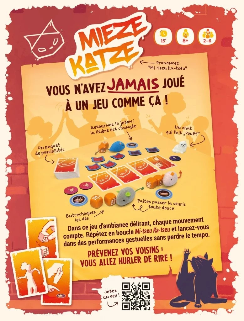 Montez sur scène et préparez votre spectacle félin ! Dans Mieze Katze, chaque joueur réalise des gestes et des sons rythmés en boucle, tout en ajoutant progressivement de nouvelles actions. Plus vous avancez, plus le show devient délirant. Fous rires garantis !