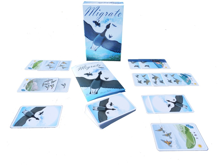 « Migrato » est un jeu de cartes où vous devez créer et gérer des colonies d’oiseaux, en veillant à les faire arriver à destination en sécurité. Chaque type d’oiseau a un objectif spécifique de cartes à atteindre. Vous pouvez jouer des cartes Oiseaux pour démarrer ou compléter des colonies, et des cartes Dangers pour influencer le jeu de votre adversaire. Les cartes Oiseaux nocturnes ajoutent un élément de surprise car elles se posent face cachée. Le jeu se termine quand un cinquième type d’oiseaux atteint son objectif, et le joueur avec le plus grand nombre d’oiseaux dans ses colonies gagnantes l’emporte.