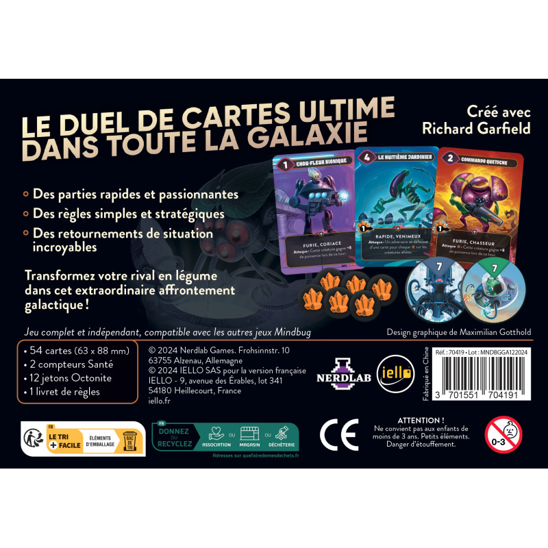 Dans un univers aussi délirant que savoureux, des pastèques explosives, oignons cyborgs et autres OVNIF (Objets Fruités Non Identifiés) s’affrontent dans un duel intense pour le contrôle galactique. Mindbug : Bataille de Fruits Galactique reprend l’humour absurde et les visuels percutants de la série Mindbug pour offrir une expérience toujours aussi fun, accessible et stratégique.