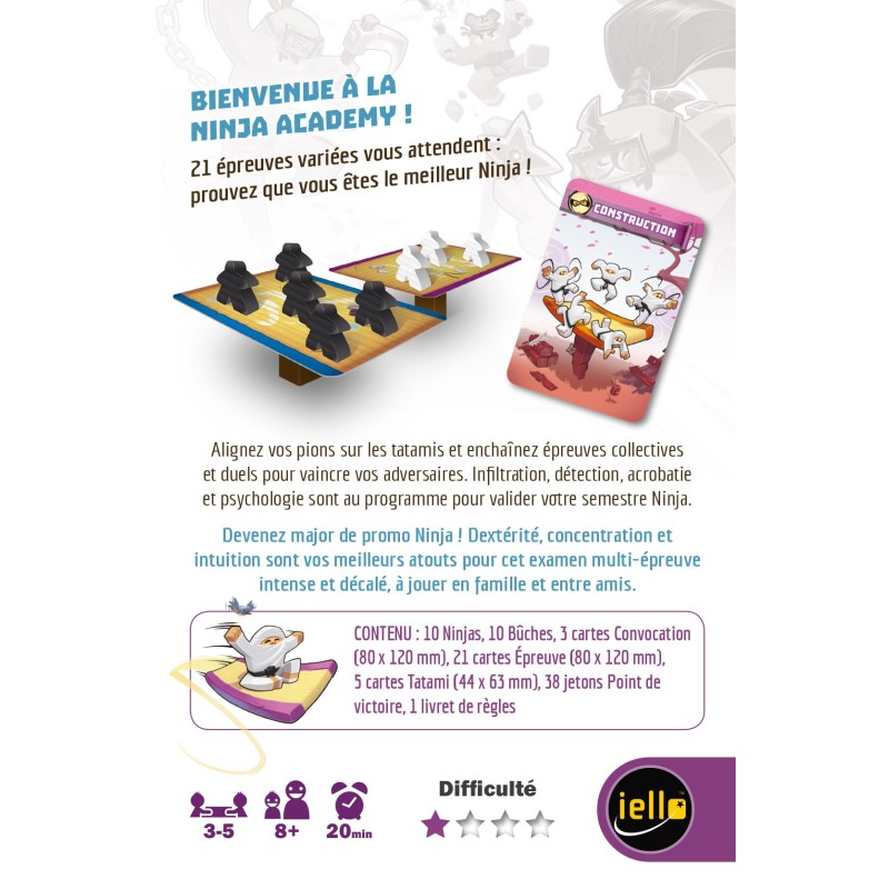 La voie du ninja vous attend ! Plongez dans l’univers trépidant de Ninja Academy, un jeu d’ambiance où réflexes, intuition et précision sont vos meilleurs alliés. Affrontez vos amis à travers une série d’épreuves délirantes pour prouver votre maîtrise de l’art ninja.