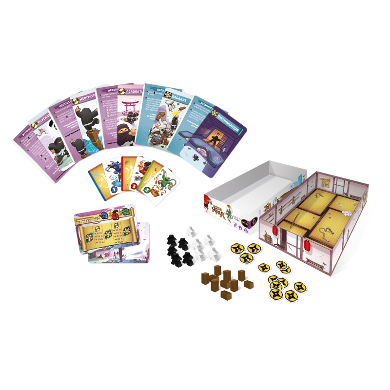 Le jeu propose 20 épreuves diversifiées, alternant entre défis collectifs et duels. Lors des duels, les autres joueurs parient sur le vainqueur, ajoutant une dimension stratégique et interactive. Les épreuves sollicitent dextérité, bluff et précision, avec des missions telles que l’empilement de pions Ninja, des lancers précis ou encore des devinettes basées sur la perception.