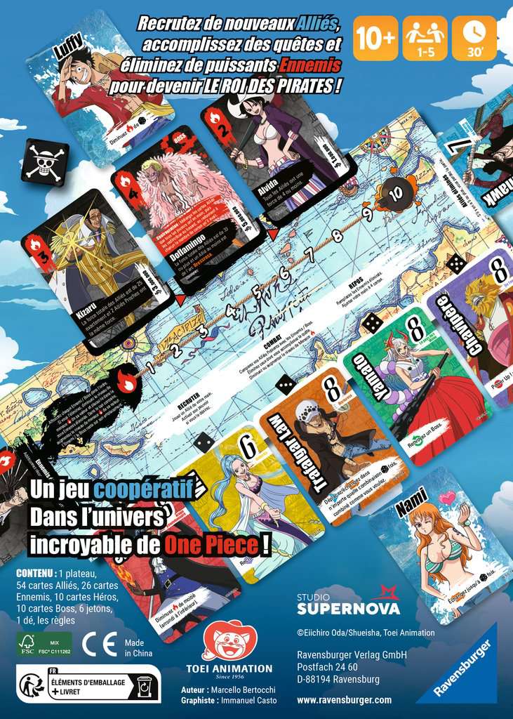 Chaque joueur incarne un membre de l’équipage du Chapeau de Paille. À tour de rôle, vous résolvez des quêtes et gérez les cartes Alliés et Ennemis pour progresser dans l’histoire. Le jeu mêle stratégie, coopération et montée en puissance. Les récompenses récoltées permettent d’améliorer votre équipe et de vous préparer aux défis à venir. Accessible même aux non-initiés à l’univers One Piece.