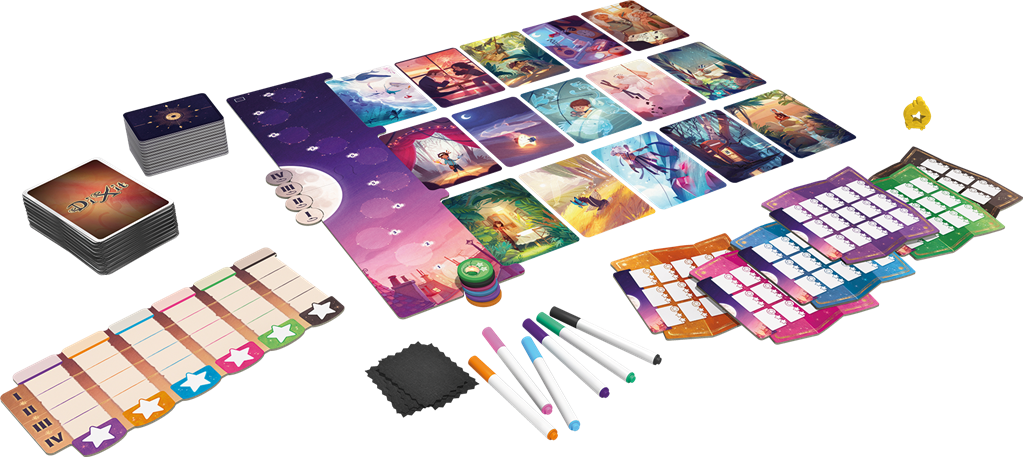 Stella est un jeu compétitif d’interprétation d’images qui explore une nouvelle approche de l’univers Dixit. À partir d’un mot, trouvez des associations entre ce dernier et des cartes Dixit révélées aux yeux de tous. Pour marquer des points, choisissez les mêmes images que vos adversaires : plus vous en avez, mieux c’est. Il vous faudra prendre des risques pour l’emporter, mais ne tentez pas de monter trop haut dans les étoiles car plus lourde sera la chute !